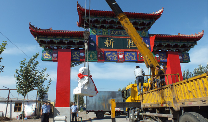 2015年9月17日,乾坤园向双城区新兴镇新胜村捐赠石狮瑞雕以支援新农村建设。石狮用汉白玉整体雕刻而成,高度近2.5米,单体重量近万斤,矗立于新胜村“平安门”牌楼的两侧,守护人们吉祥、平安的石狮 ,成为了当地的“守护者”。