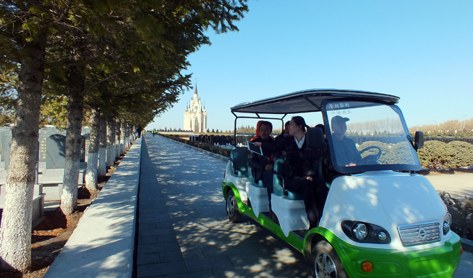 经过漫长“冬眠”的电动观光车今日重新上岗,伴着明媚的春光,它载着选购墓位的用户徜徉在墓区的景观大道上……