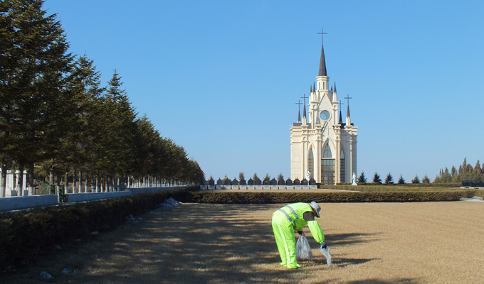 一尘不染迎接祭扫高峰 第一个清明祭扫高峰日的下午,环卫工人们正忙碌着清理道路上的污渍,拾捡着墓区里的垃圾,明天,乾坤园又将以焕然一新的面貌迎接新的祭扫高峰。