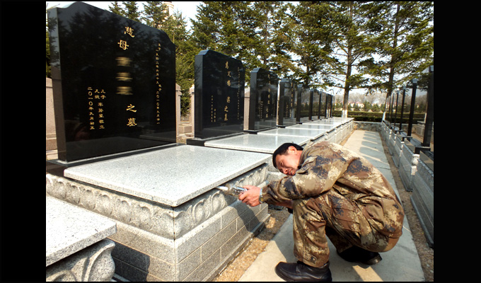 墓位维修进行时 进入春季,干燥的空气使封墓胶逐渐开裂。尽管今天的风很大,但墓位科的工人们却仍然整天都在墓区穿梭。五一之前,他们要对墓区数万座墓位进行逐一检查打胶。