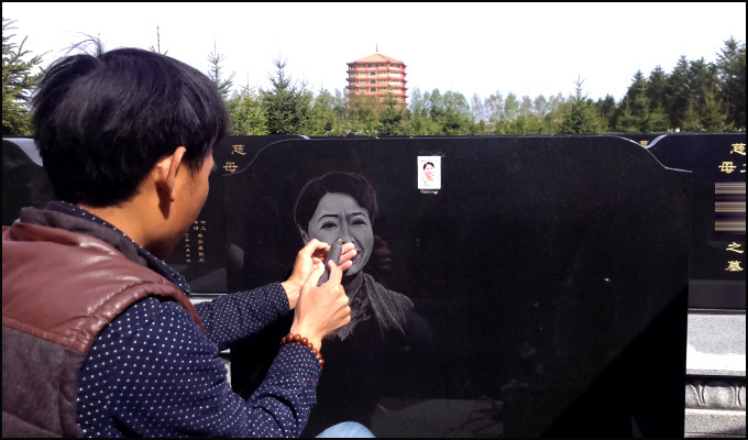 每一幅影雕都是艺术品 春季伊始,乍暖还寒。墓区中的刻像师傅已经开工了,一张张逝者的容颜在他的锥、杵下栩栩如生,或俊美、或端庄、或严肃、或慈爱,这些都将附着在墓碑上,与其永恒!