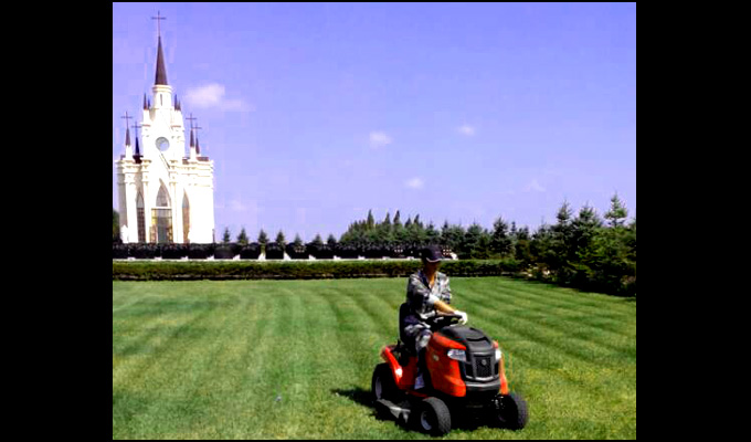 驾驶式剪草机开工 炎热的天气,让整个墓区显得更加宁静。在闷热的空气中,隐约可以嗅到一股清新的青草香——园林工人驾驶着剪草机正一丝不苟的修剪着草坪。在整齐、崭新的草坪包围下,此刻的墓区显得更加有序、壮观。