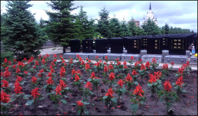 细雨沥沥,墓区中精心培育的“串红”已经绽放。