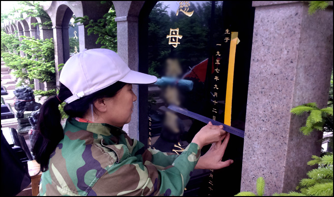 下雨天,服务不停歇 经历连日的降雨,湿滑的墓碑给贴碑师傅吴晓兰的工作增加了许多难度。没有“雨休”的她今天又连续贴了17份碑文,虽然手举得酸痛,但她始终一丝不苟的丈量着每一个字间距,力求完美。