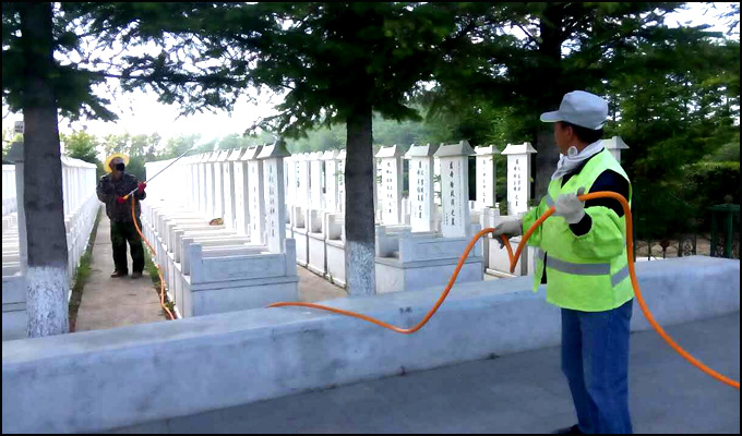 炎炎夏日,甜腻的松树浆招惹了不少的小虫。为让树木茁壮的成长,园林师傅们正细心地为每一棵松树喷洒农药……