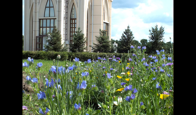 教堂边的花带已经绽放,夏日里,随风摆动的小花,充满了文艺、淡雅的气息。