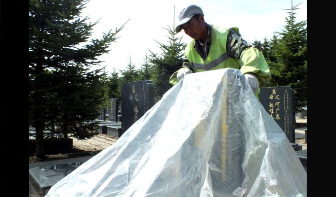 入葬前的准备 墓位科的工人师傅今天下午比较忙。他们不仅要把明天将要使用的墓位打扫干净,还要及时对待修墓位做好修缮工作。为了不让雨水浸湿待用墓位,他们通常用塑料布把收拾干净的墓位遮挡上,办法有点土,但很实用……