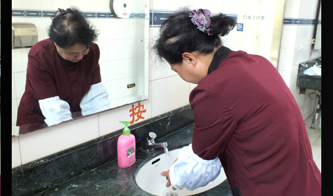 经过了一天的接待,张阿姨似乎有点疲惫,但无论是清洗、拖地,她仍然尽心的收拾着每个角落……