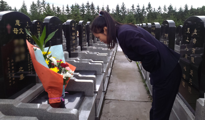 令逝者安息、生者释然 即使用户身在外地,不能来园祭扫,但乾坤园礼仪部门的员工依然会替用户尽孝。虽然天空不时飘着细雨,但工作人员仍然从容的献花、鞠躬,一丝不苟的完成着任务。