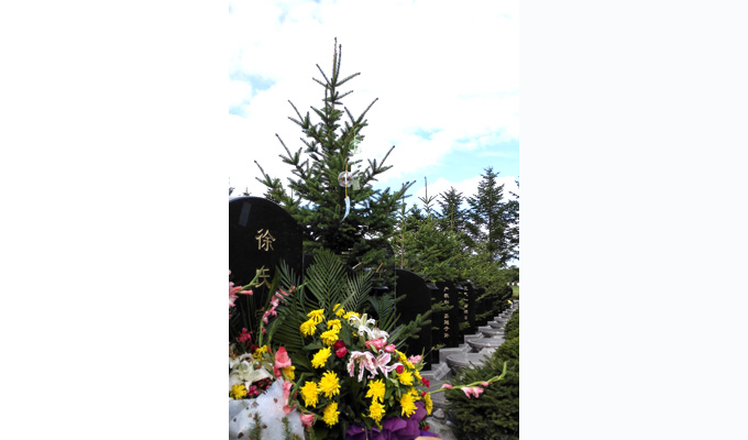 在墓位旁的青松上系两串风铃,以铃声为语、用清风带去思念,让长眠在墓区的亲人不在孤单。