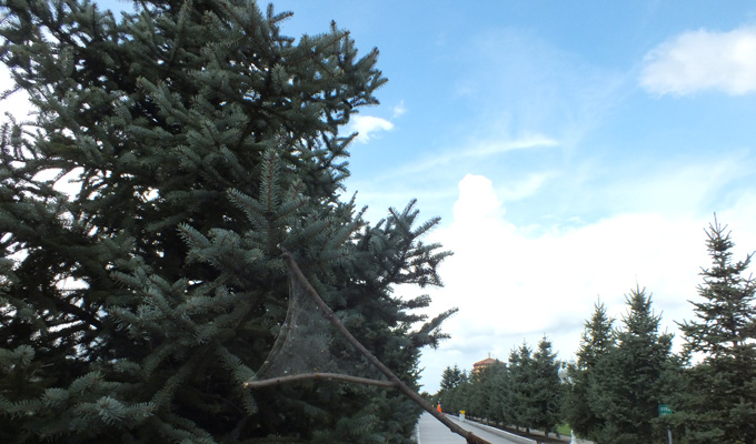 清除蜘蛛网 入秋后,墓区中的松树上时常结许多蜘蛛网,不仅影响美观,也十分影响行人通过。因此,近来,园林工人们又多了一件工作——利用闲余时间,粘掉蜘蛛网。