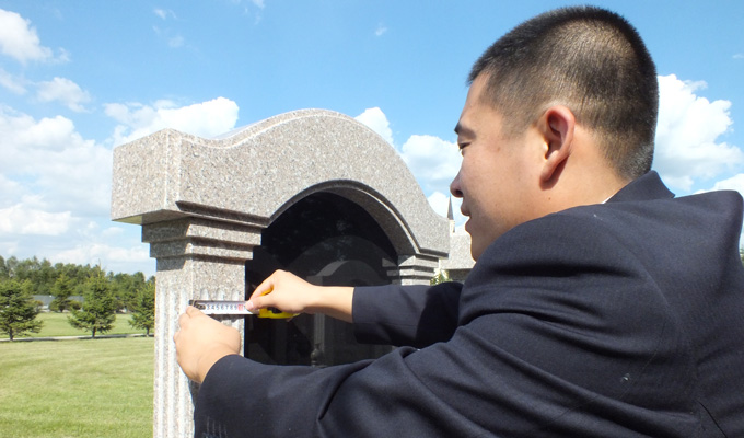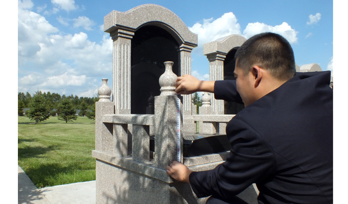 验收墓位 尽管新建墓位已经精益求精,但接待部门验收起来丝毫不含糊,无论是石材薄厚、基准线还是工程缝,工作人员一丝不苟的对每一座墓位进行着最后的完善。