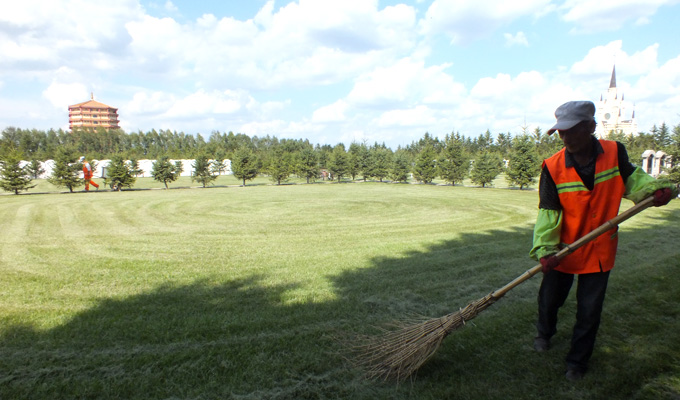 细致清扫草坪 即使草坪已经被剪草机修剪的平整无比,但工人师傅仍然用扫帚仔细的把剪掉的草清理安静,蓝天下,方正、碧绿的草坪不禁让人心神愉悦。
