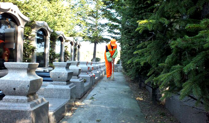 清扫落叶 树上的叶子渐渐黄了,飘落的树叶像一只只金黄的小鸟,上下翻飞。外人的眼中,尽是美景。但环卫工人们却并不轻松,他们必须随时清理掉落叶,以保持墓区的洁净。 图/寇彬彬 文/寇彬彬