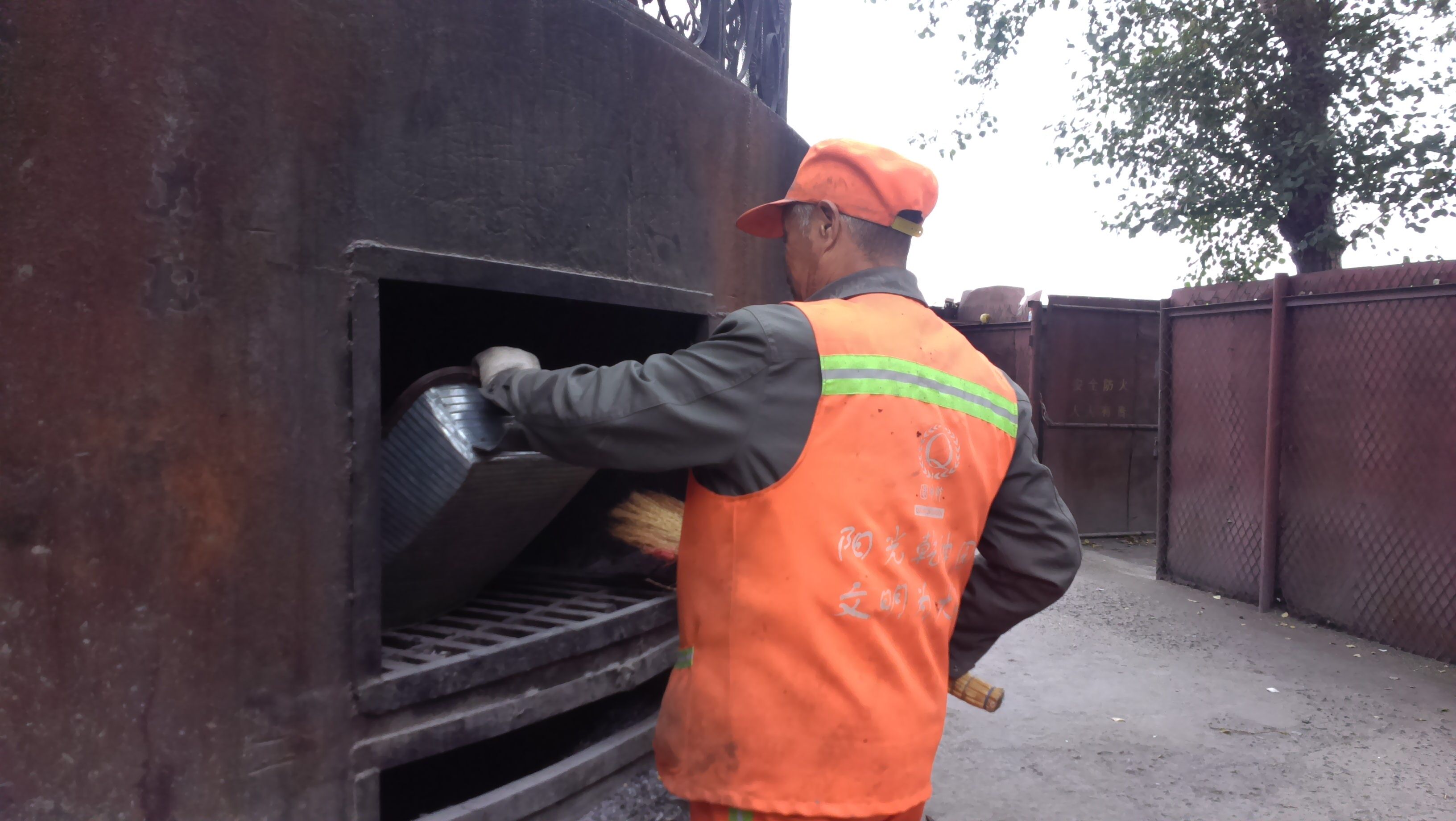 来到焚烧区,老张正在专心地清理上午用户焚烧残留的纸灰,这是他每天重复的工作,虽然单调辛苦,但他从不降低标准,保证设备整洁,为第二天用户使用。