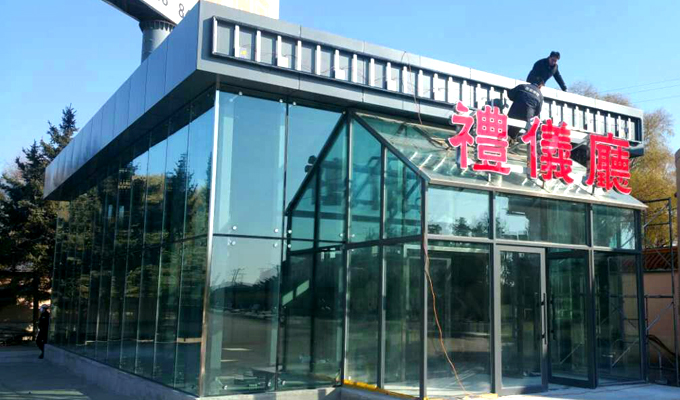 虽然冬日临近,礼仪厅的装修工作仍然进行着。图为专业技术人员在礼仪厅玄关上方安装LED屏。 图/毕晓娇 文/寇彬彬