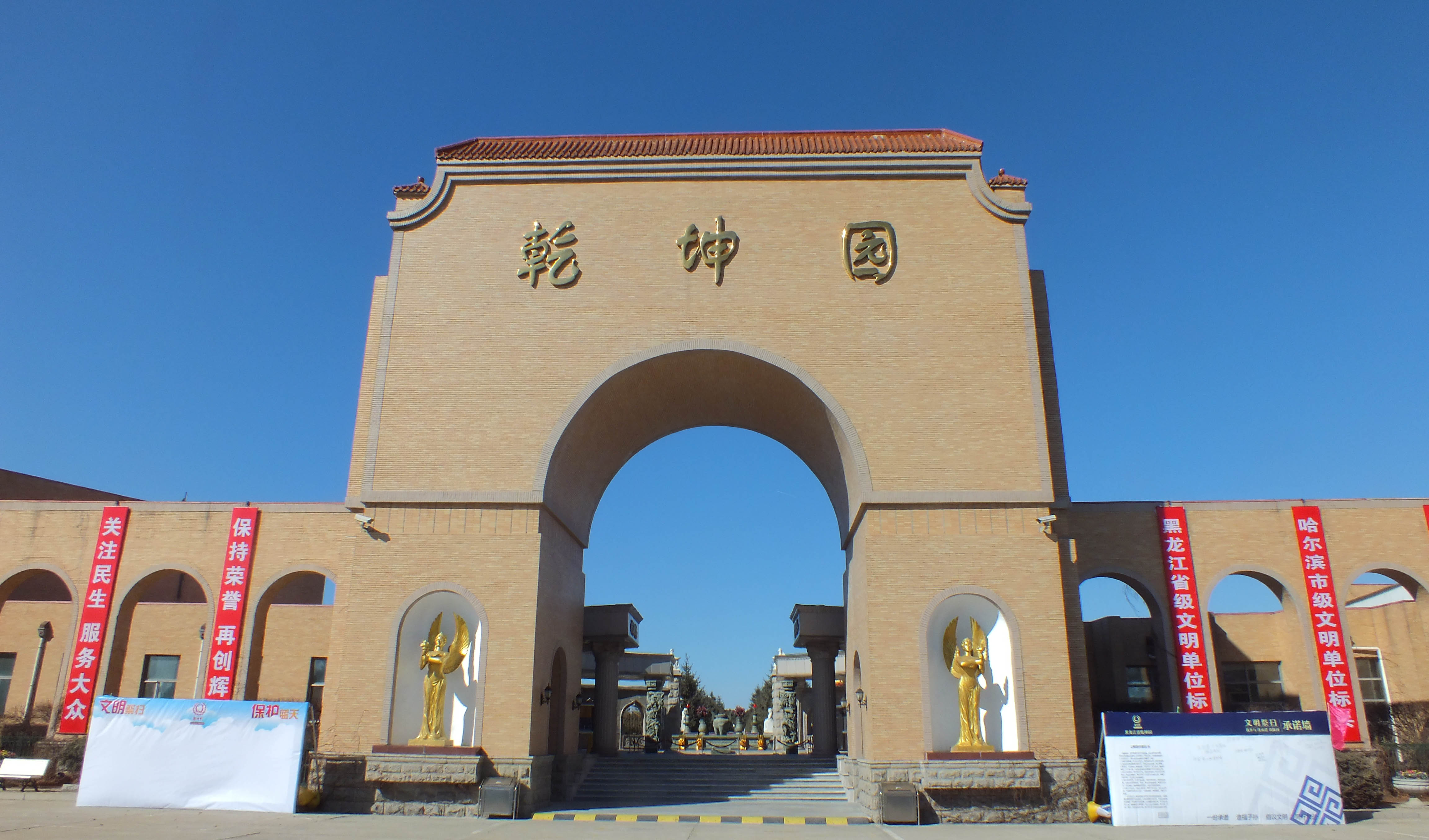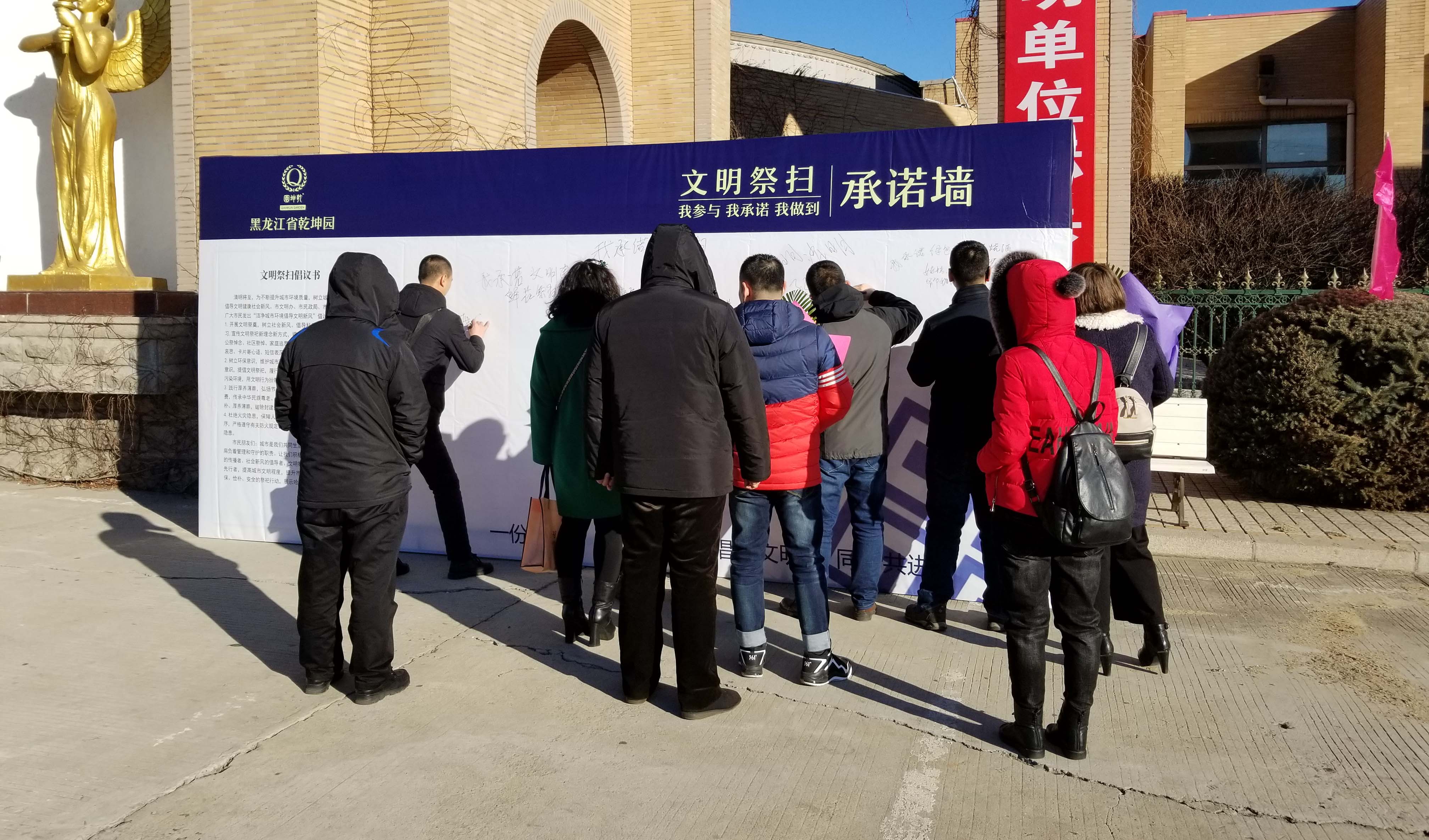 文明祭扫,保卫蓝天 省级文明标兵单位,黑龙江省乾坤园组织发起了“文明祭扫承诺墙”活动。号召广大市民鲜花祭扫,文明祭扫。共同营造一个绿色文明的清明节。