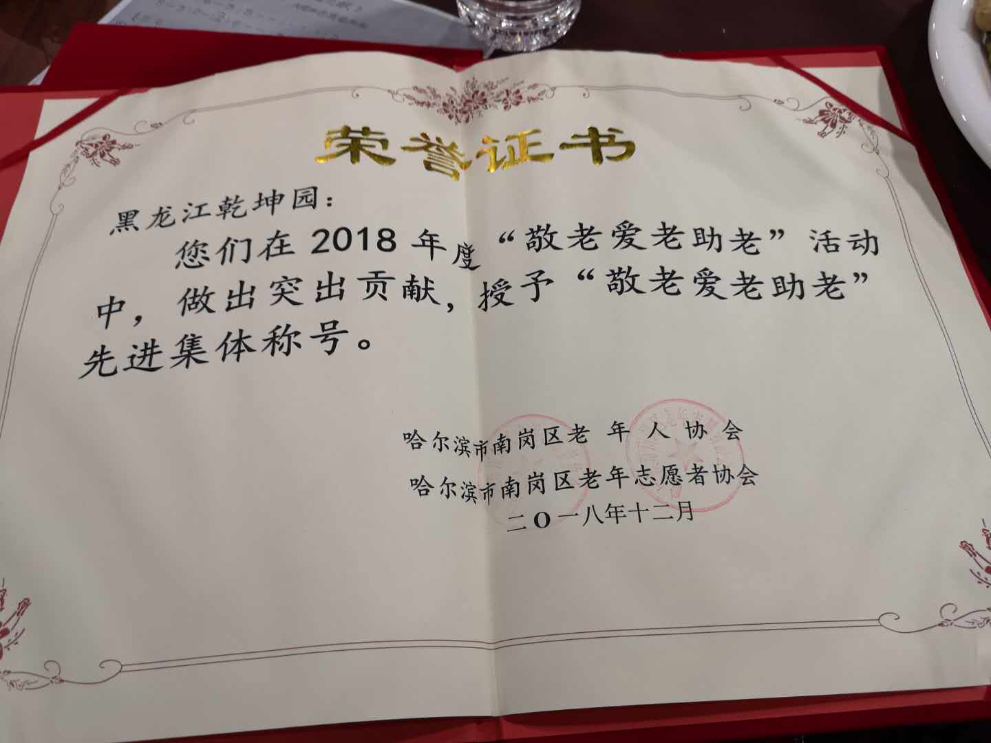 敬天下老人,扬中华美德 黑龙江省乾坤园多年来始终坚持热心公益事业,长期与南岗区老年协会、老年志愿者协会合作进行助老活动。今天,在2018年度“敬老爱老助老”表彰大会上,乾坤园贡献突出,被授予“敬老爱老助老”先进集体称号。在敬老爱老这条公益道路上乾坤园已走过25个年头,今后我们会将敬老爱老事业进行到底。