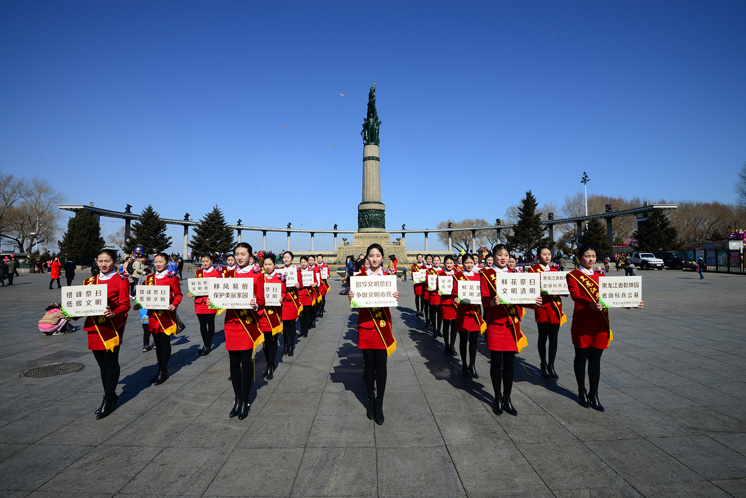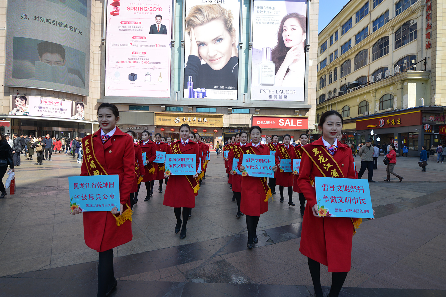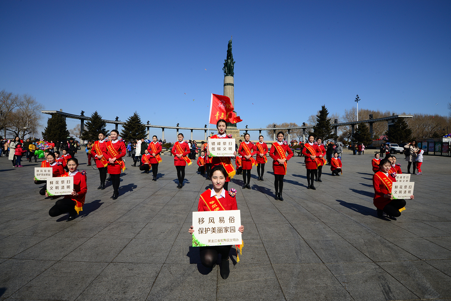 今日,乾坤园组织文明祭祀志愿者们在哈市秋林商圈、中央大街、防洪纪念塔等地进行了文明祭祀宣传活动。在清明节即将来临的时节,为了倡导广大市民移风易俗、文明祭奠,他们用这种特殊的方式进行了文明祭祀宣传活动。