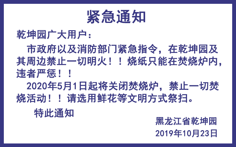 市政府以及消防部门紧急指令,在乾坤园及其周边禁止一切明火!!烧纸只能在焚烧炉内,违者严惩!!